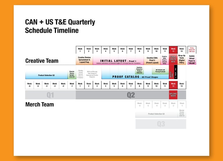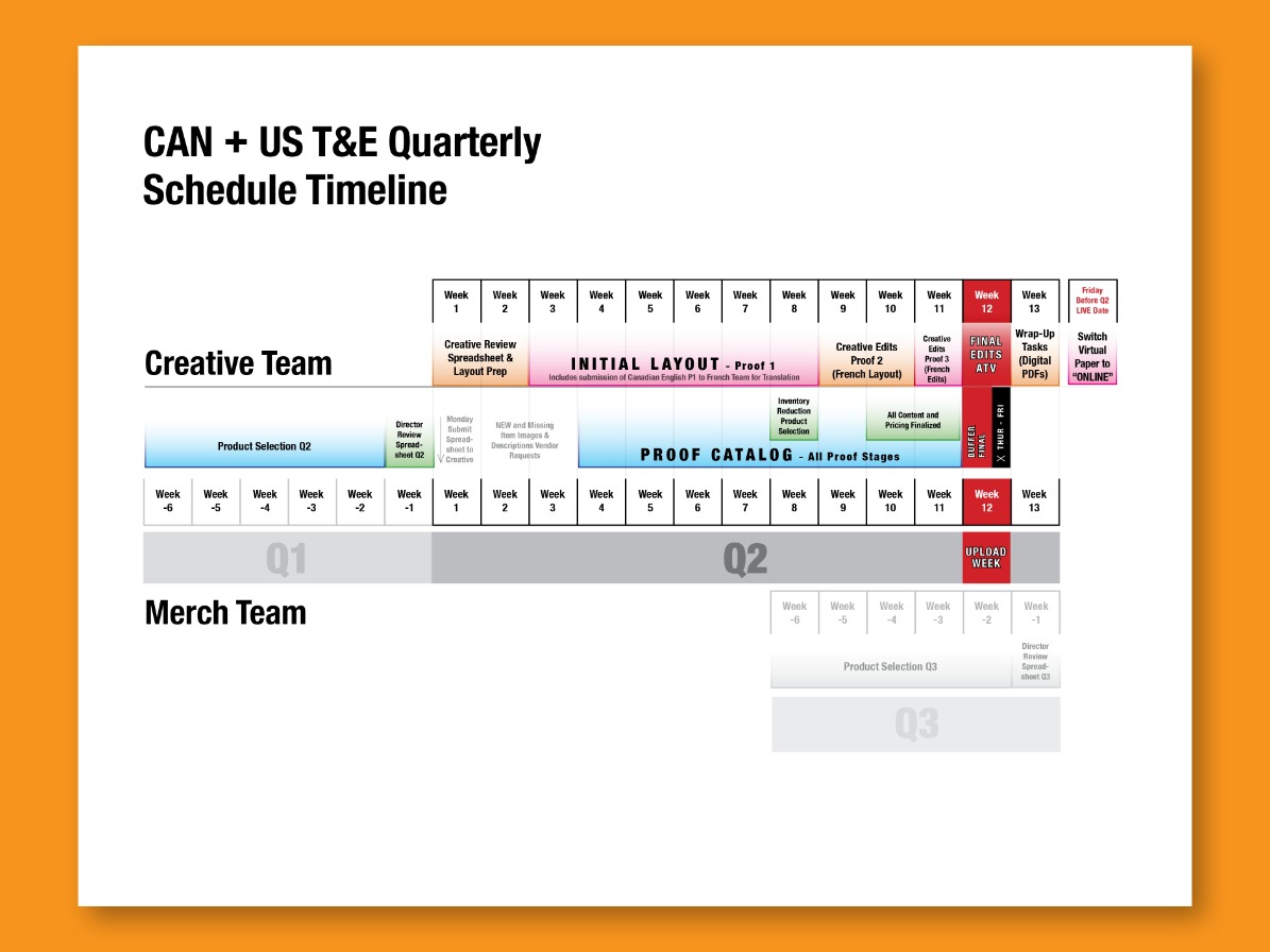 Below is one of the style guides clearly showing how my created paragraph and character styles should be applied to a product description. I created a workflow timeline graphic that defines the creative and merchant teams roles and milestones for each production and proofing stage to meet final deadlines for print and digital catalogs.